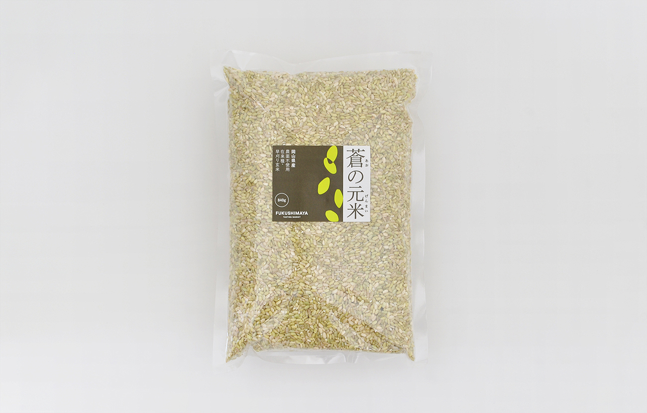 「蒼の元米」は、成熟前に収穫した蒼い玄米。